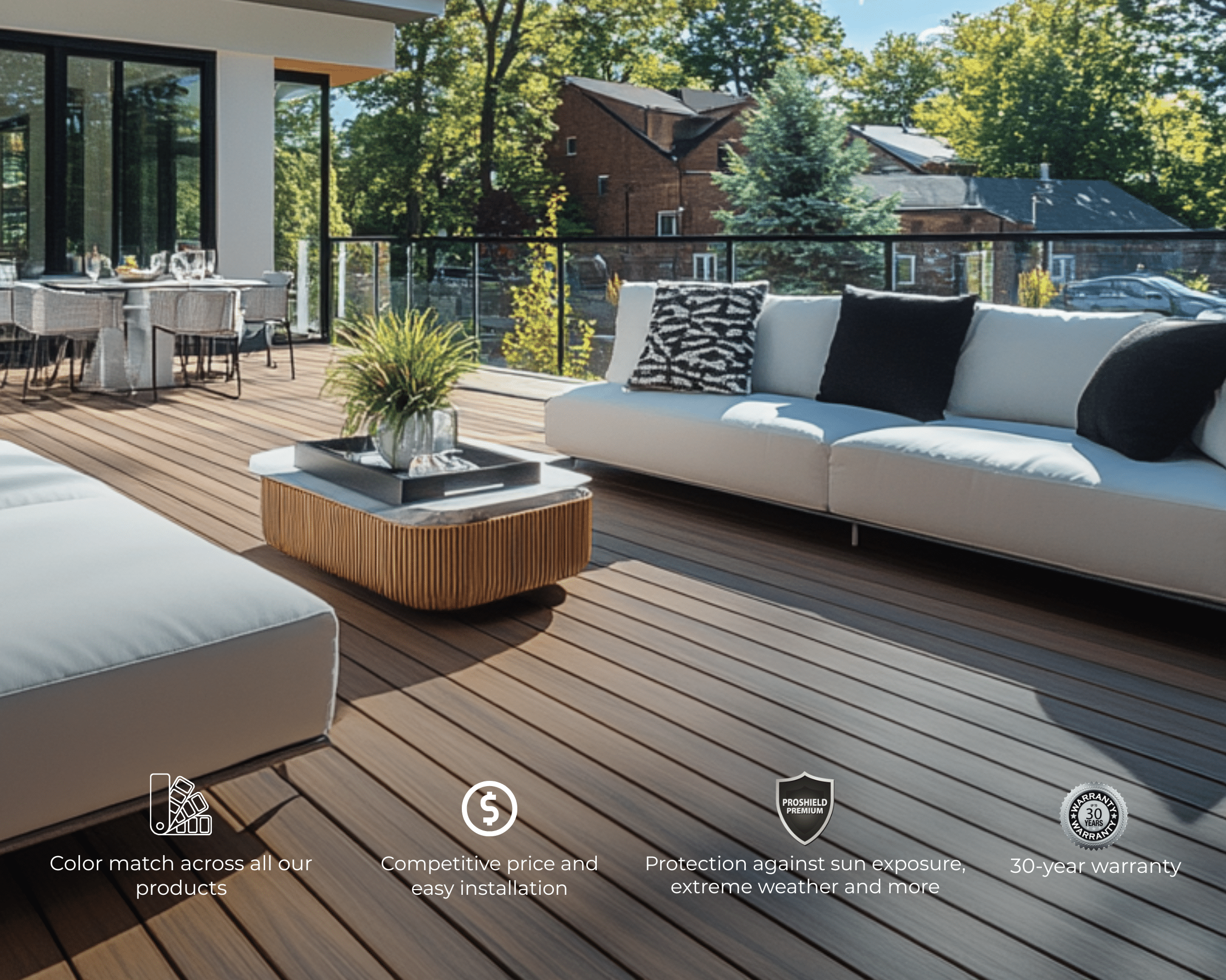 Engineered through a high-performance co-extrusion process, each composite decking board is protected on all four sides with Proshield Premium®, delivering superior resistance to fading, staining, moisture, and UV exposure. Unlike traditional wood, Advantage boards won’t crack, warp, or splinter—making them the perfect solution for Canadian climates and low-maintenance living.